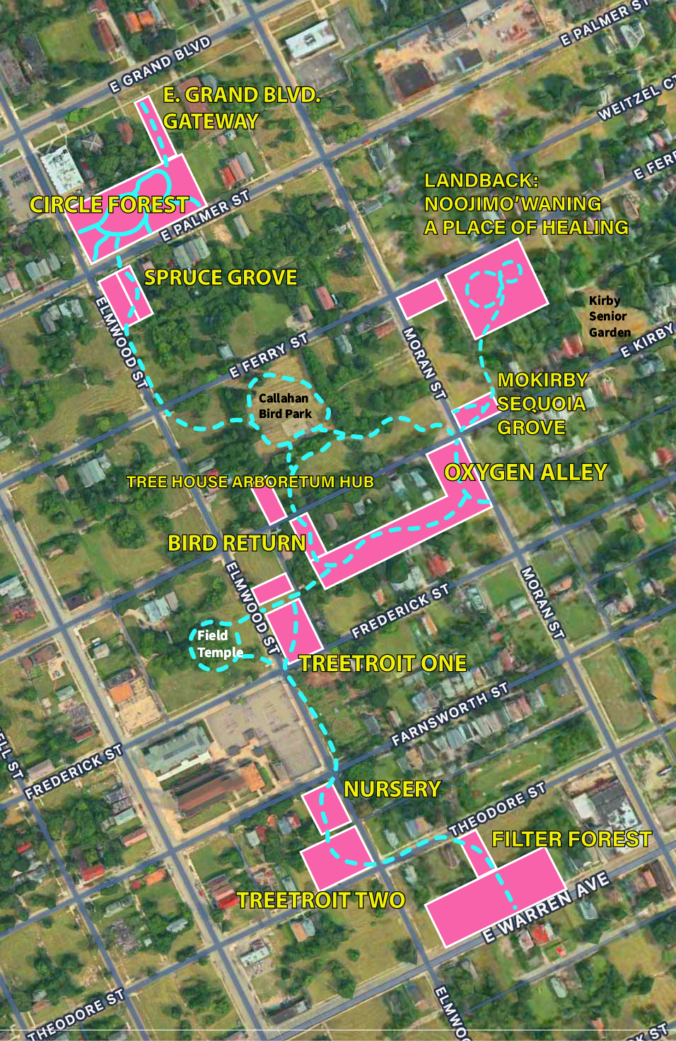 To achieve more connected green space without a large area of land available, while making it more accessible to more neighbors, we are connecting these spaces into a winding park.